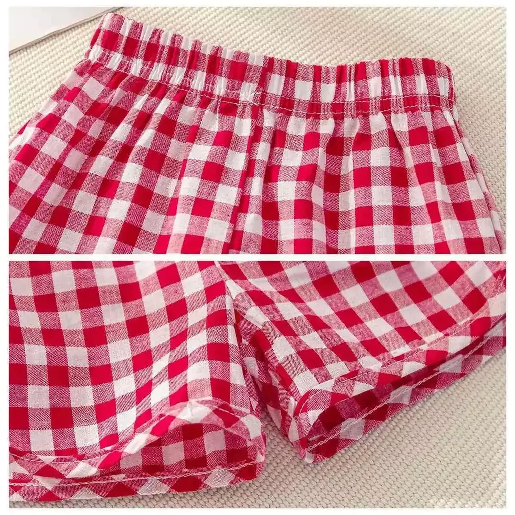 Estampa do Shorts: Padrão clássico Xadrez Vichy (quadriculado pequeno) em cores suaves e pastel, combinando com a estampa da camiseta: Amarelo, Cinza/Verde Claro, Vermelho/Rosa, Azul e Rosa.
