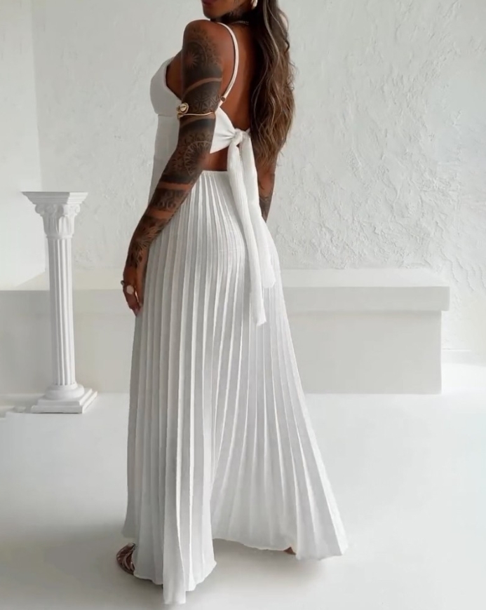 Sinta-se uma verdadeira deusa grega com o nosso Vestido Deusa Plissada, a definição de elegância, leveza e movimento. Na cor branco puro ☁️, esta peça é um clássico atemporal que exala sofisticação.