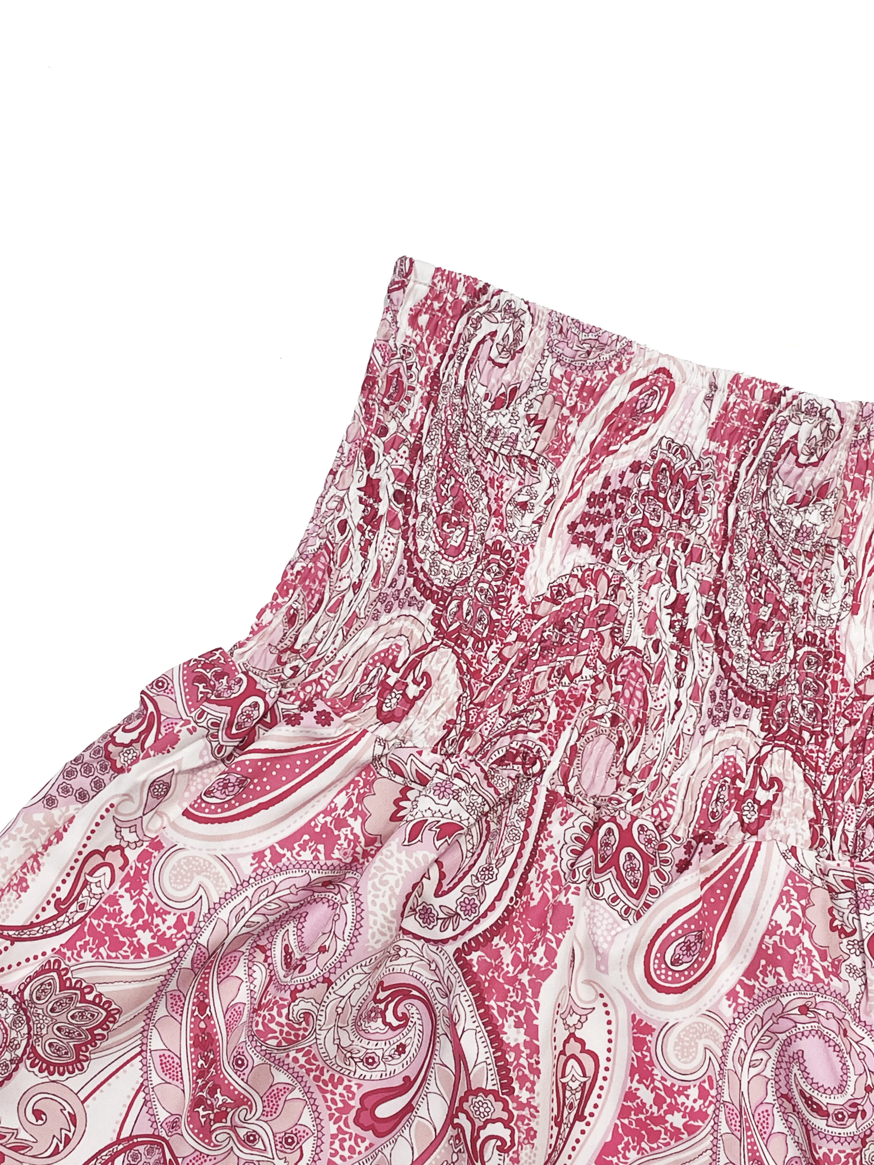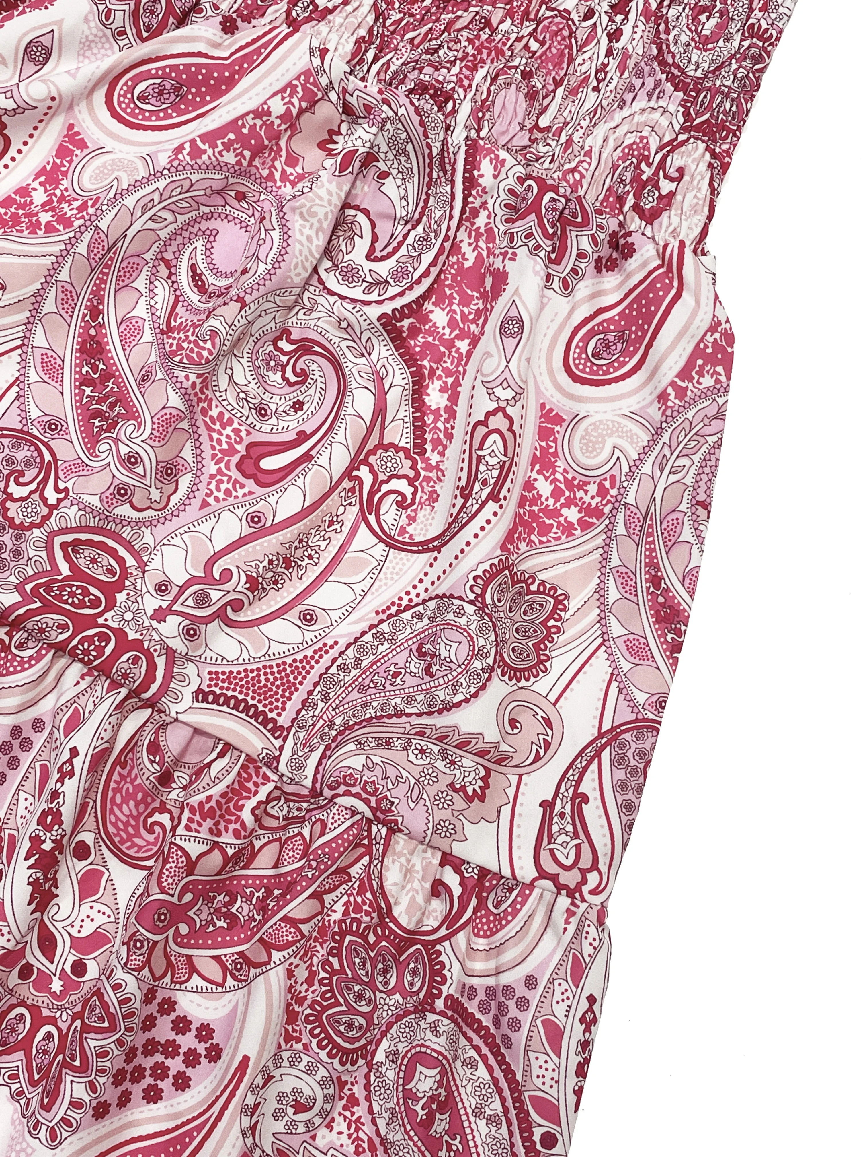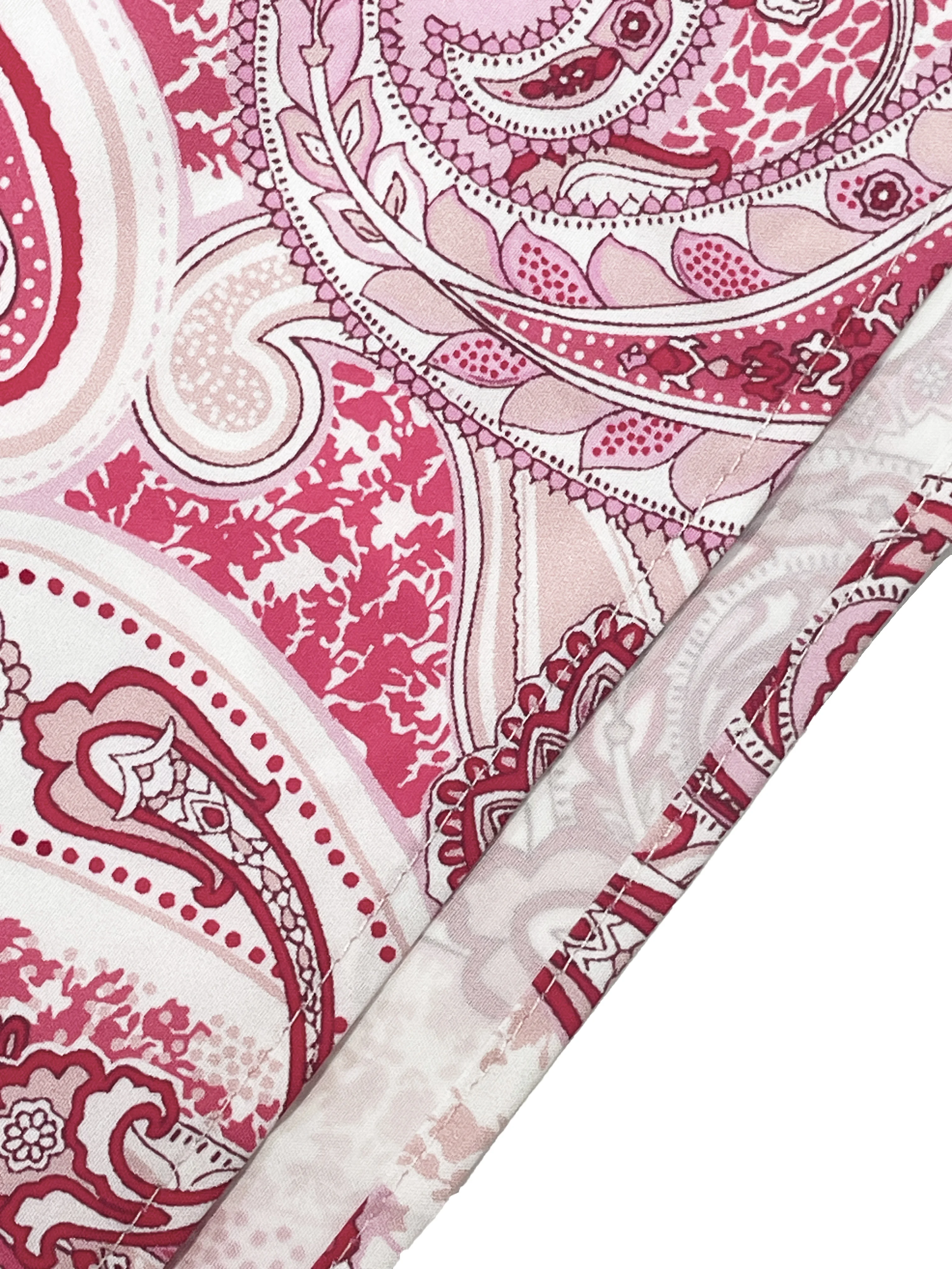 Estampa: Estampa clássica Paisley (ou Caxemira), com arabescos em tons de rosa, branco e detalhes sutis em vermelho, que remete à moda vintage e boho. 💖