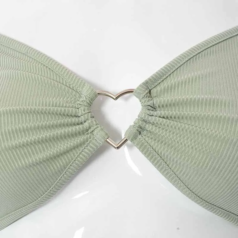 Design Central: Abertura (cut-out) na parte frontal abaixo do busto, conectada por um elegante anel metálico em formato de coração 💖, criando um efeito de nó e franzido no busto.