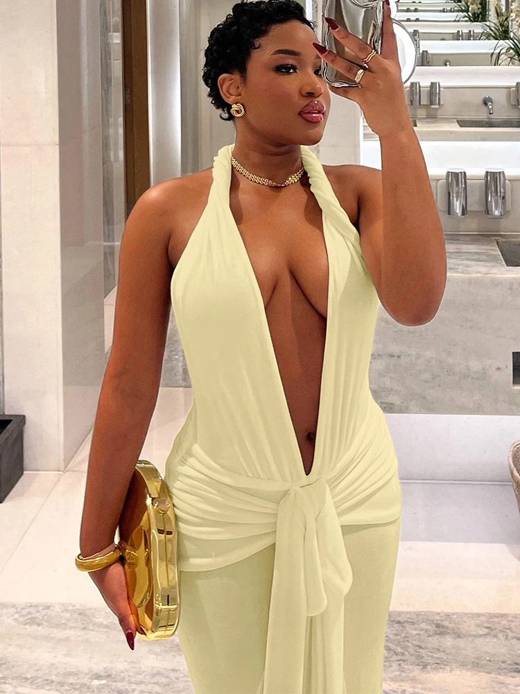 ✨ Vestido Goddess Halo: Decote Profundo, Fenda e Amarração Elegante. 🥂👑